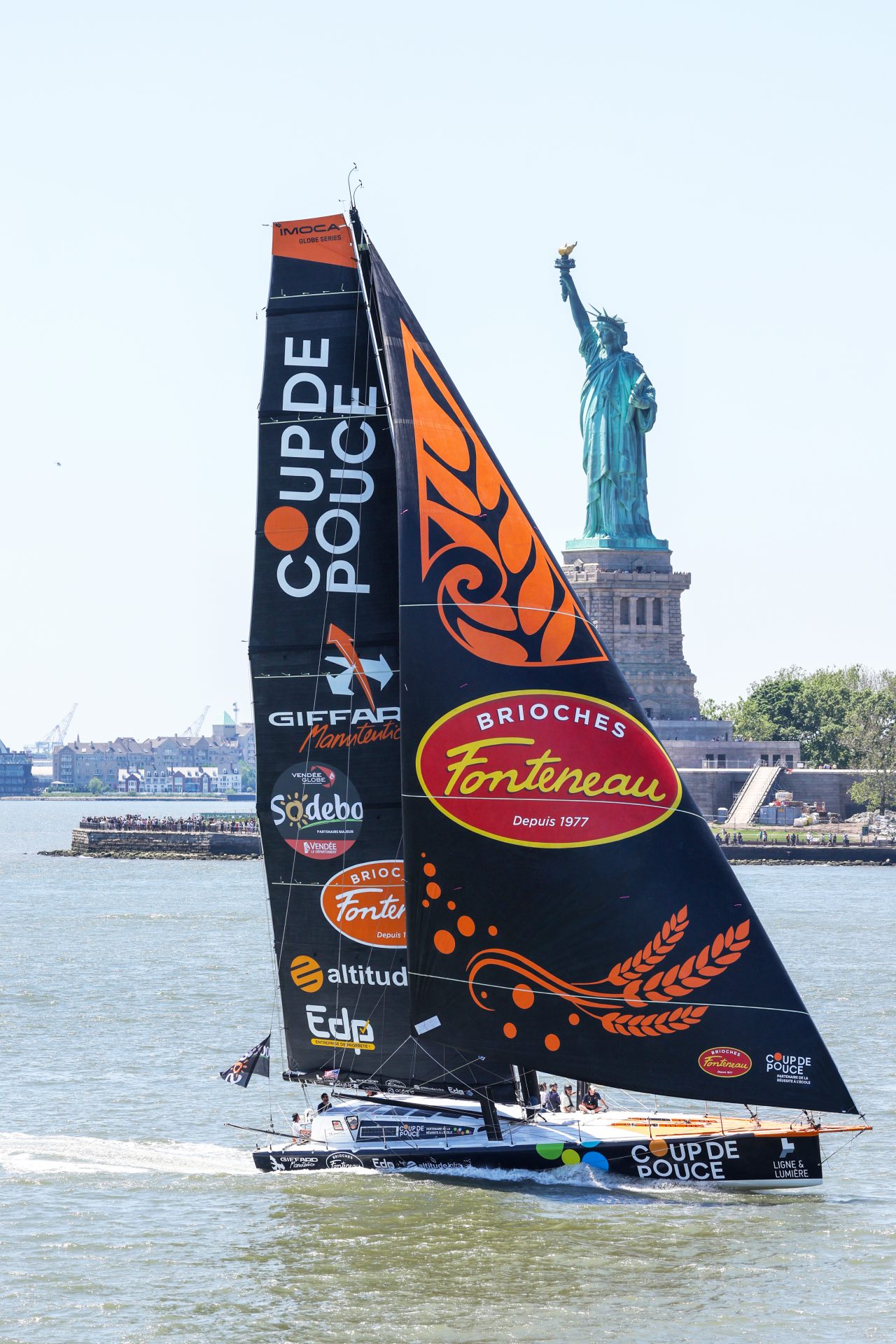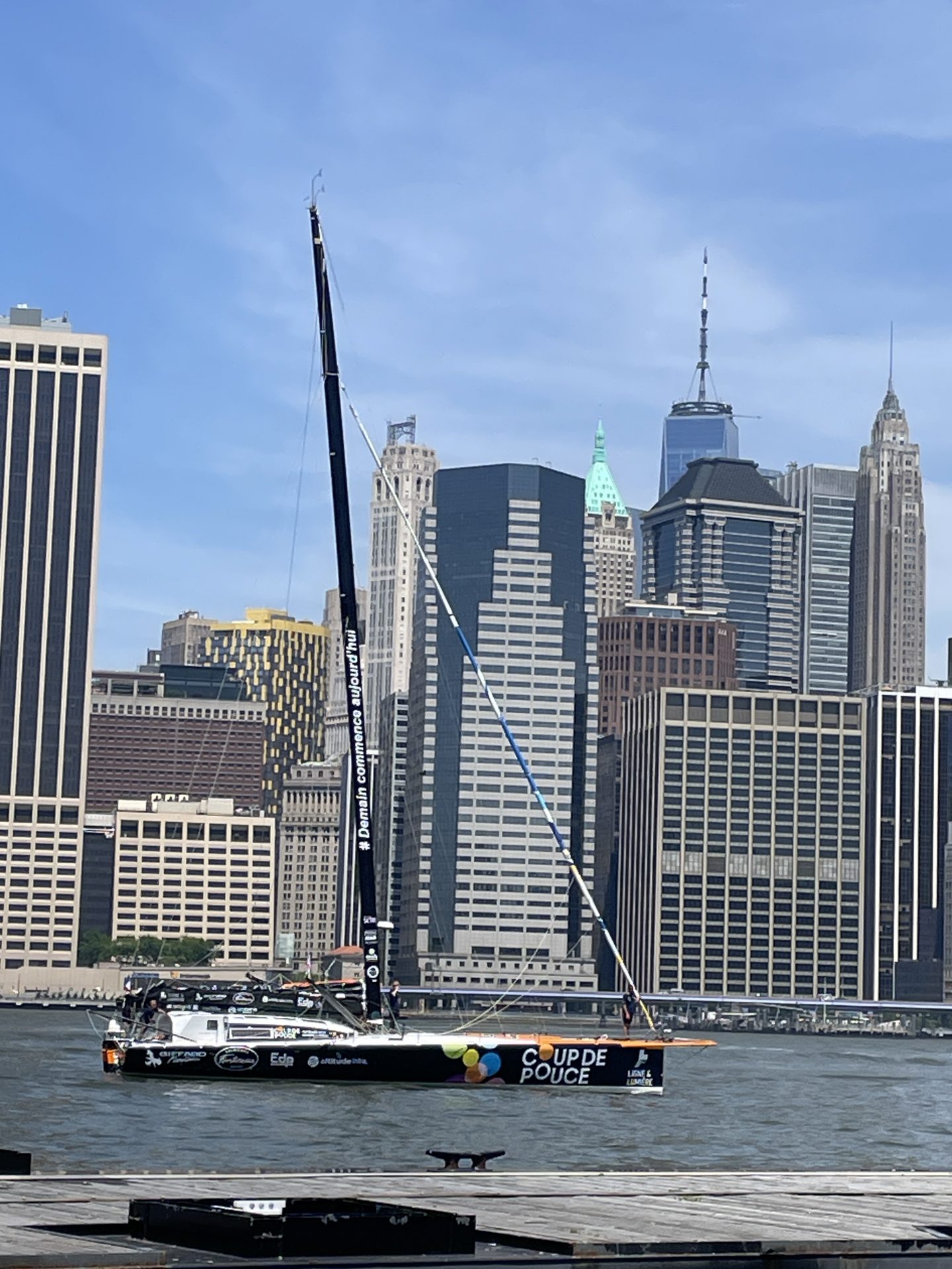 Mais il n’y a pas que le départ de la New York Vendée qui attend notre équipe ! Des runs de vitesse sont organisés en baie de Manhattan pour les IMOCA 🗽✨ Une course contre la montre sur 1 mille (1,8km), un départ, une ligne droite et une arrivée, le jeu est simple, le vainqueur sera celui qui aura réalisé le meilleur chrono. La flotte est répartie en 4 pools, Manu et son équipe, Christine et Mathieu Fonteneau également à bord, sont motivés plus que jamais ! Top départ pour Coup de pouce qui évolue dans le petit temps annoncé, parfait pour le bateau. A bord, c’est juste incroyable, le bateau file dans ses lignes et glisse sur l’eau comme jamais, saluant la statue de la liberté ! Coup de pouce terminera 1er de sa pool et 2ème du classement général ! Les étoiles se sont alignées ce jour là et comme l’a dit Manuel ‘C’était amazing !!! ».