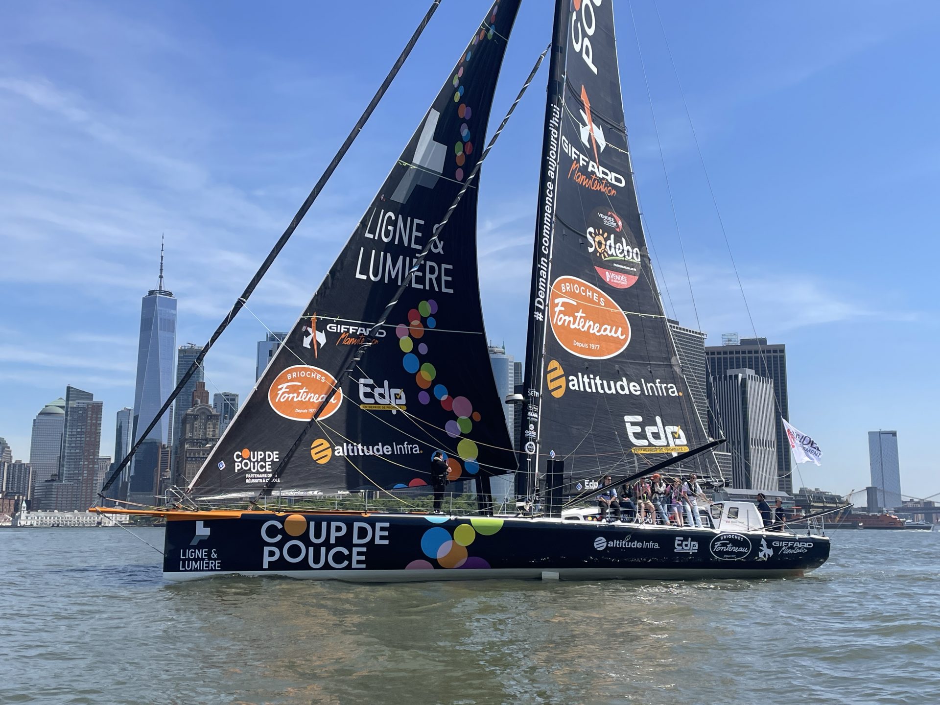 Manuel Cousin et son équipe ont quitté les Sables d’Olonne le 6 mai dernier afin de convoyer leur IMOCA Coup de pouce jusqu’à New York ! Une très bonne ambiance à bord, beaucoup d’émotion et d’envie de rallier la mythique cité américaine. Particulièrement pour Jules et Malo, préparateurs au sein du team, pour qui ce fût la première transat ! Et pas des moindres, la météo, assez costaud les deux premiers jours, a finalement été clémente tout au long de la traversée et l’arrivée sur New York juste magique !